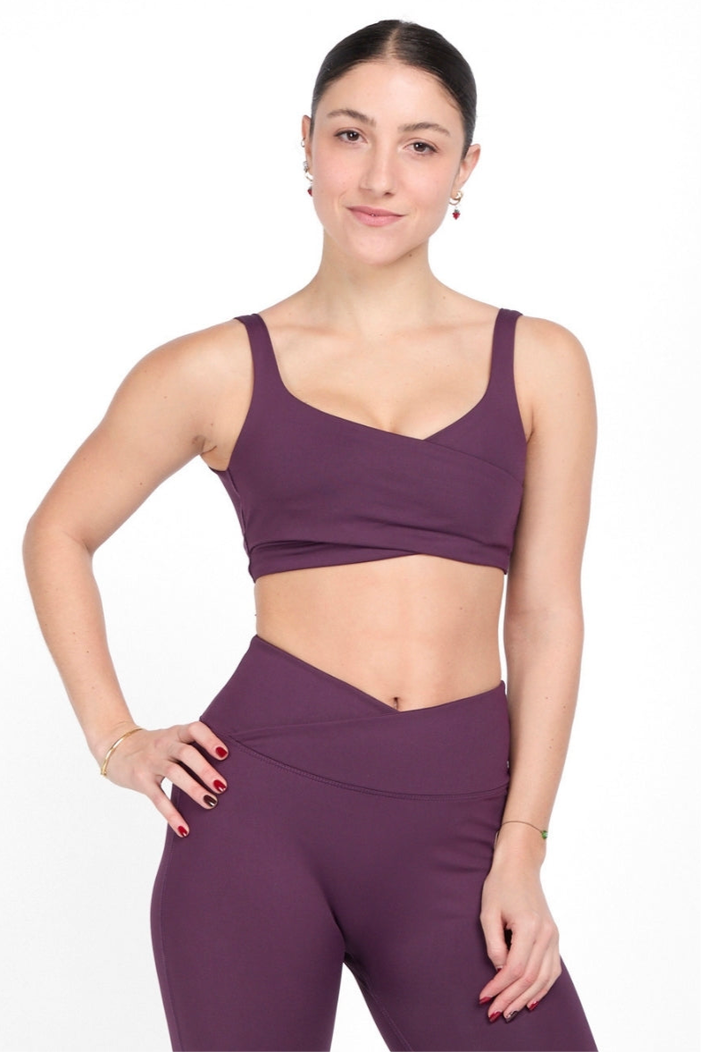 Allegro Bra – Top deportivo color Chicha con diseño cruzado para yoga, pilates y entrenamientos de bajo impacto
