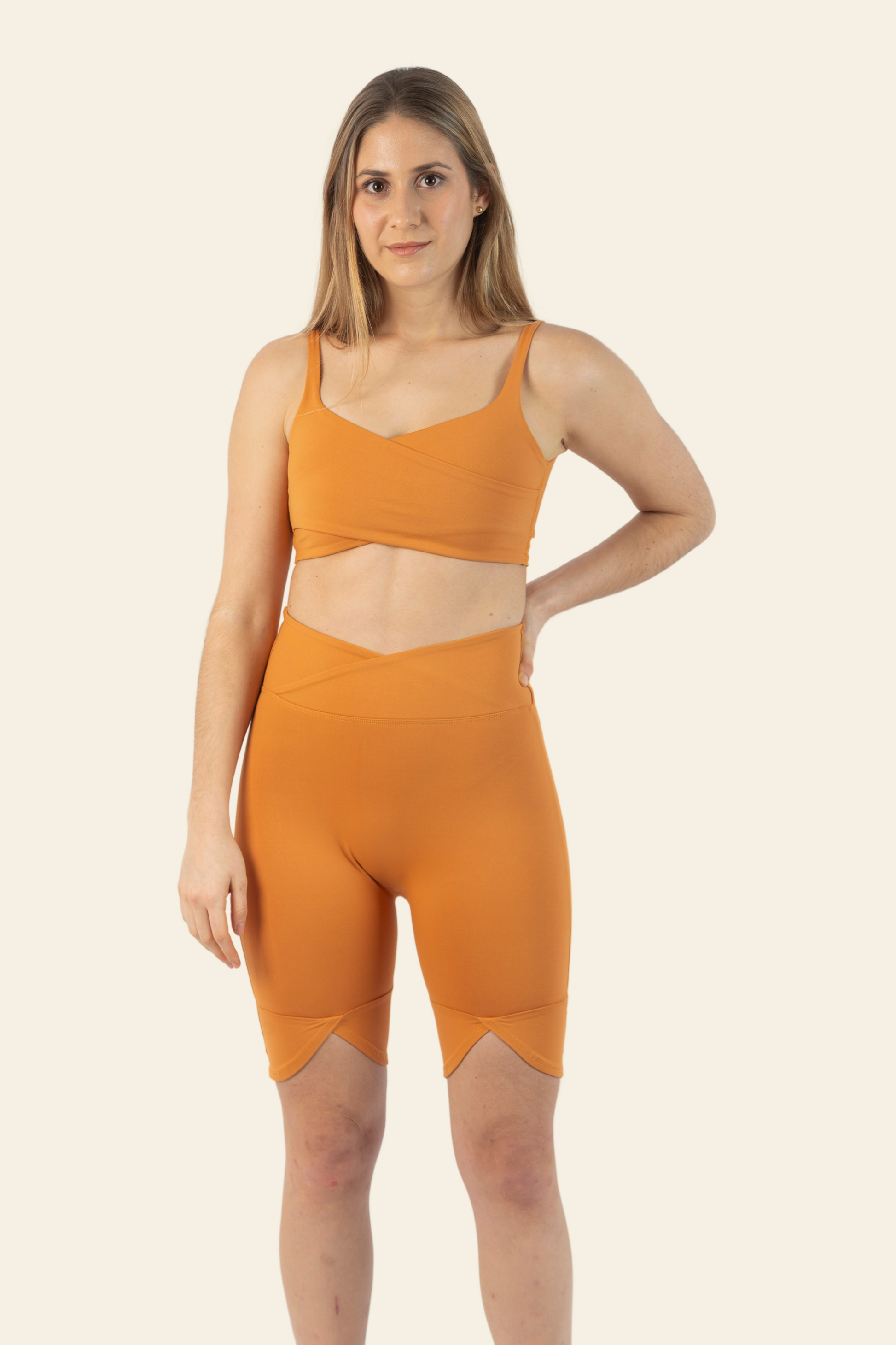 Con un diseño cruzado único en la parte delantera y un bolsillo oculto para el celular en la parte trasera, estos biker shorts ofrecen funcionalidad y estilo a la vez.